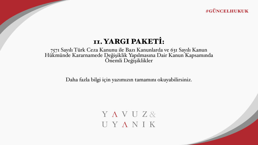 Kamuoyunda “11. Yargı Paketi” olarak bilinen 7571 Sayılı “Türk Ceza Kanunu ile Bazı Kanunlarda ve 631 Sayılı Kanun Hükmünde Kararnamede Değişiklik Yapılmasına Dair Kanun”, 25.12.2025 tarihli Resmî Gazete’de yayımlanmıştır. Bu kanun, ceza ve infaz düzenlemeleri, icra-iflas hukuku, mali ve sosyal güvenlik hukuku gibi bir dizi farklı hukuki alanı ilgilendiren kapsamlı düzenlemeler ve değişiklikler içermektedir.